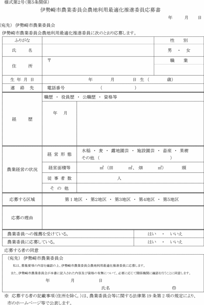 第5条 募集への応募の場合における省令第11条第1項の書類は、伊勢崎市農地利用最適化推進委員応募書(