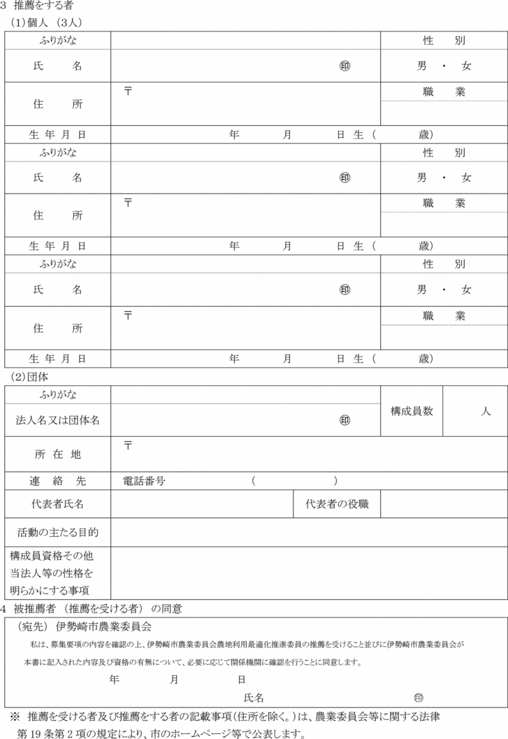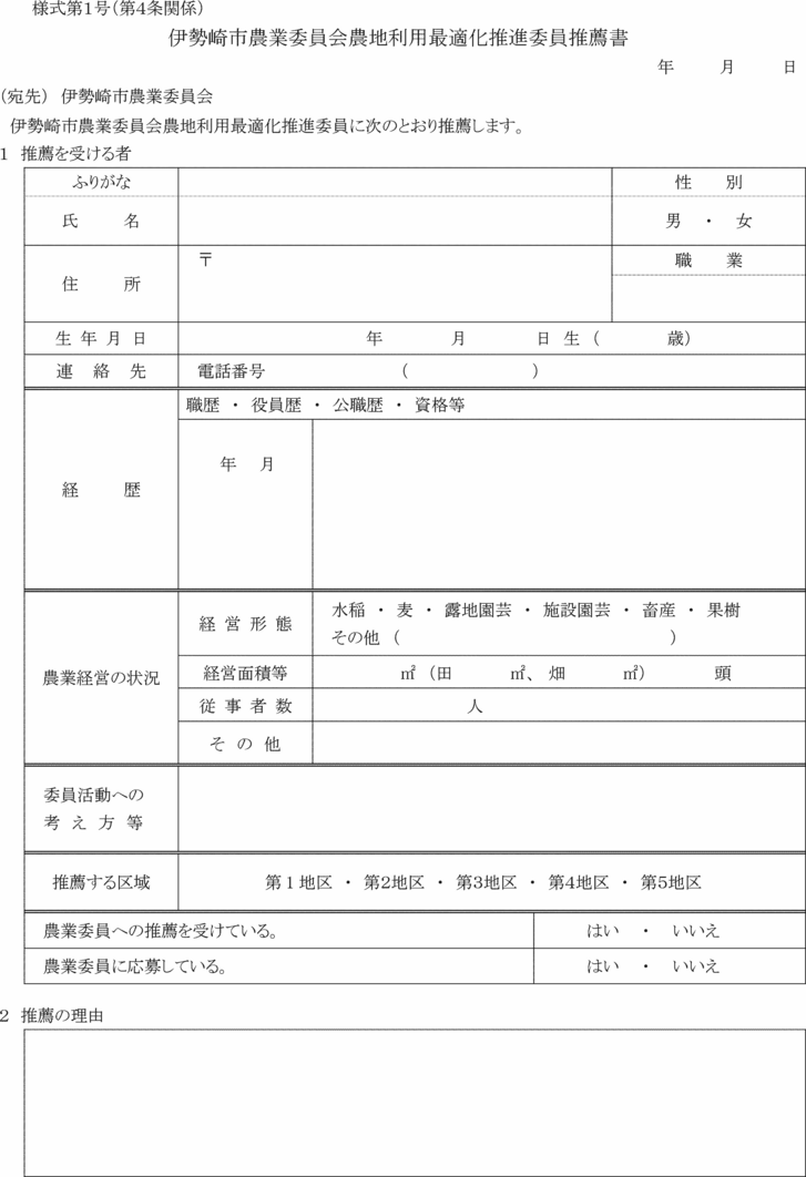 第4条 推薦の場合における省令第11条第1項の書類は、伊勢崎市農地利用最適化推進委員推薦書(